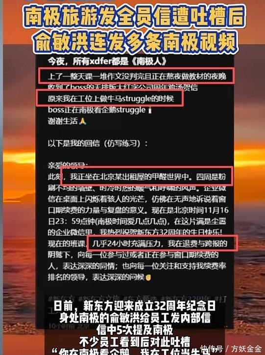 但在员工接连发出吐槽之后,俞敏洪似乎并没有看到,反而在社交平台上连续发布了十条在南极旅游的视频,视频中,他不仅分享了穿越海峡,乘坐冲锋舟。
